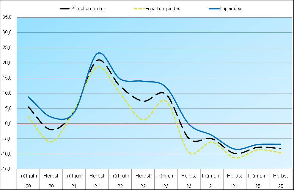 „Von einer Erholung kann keine Rede sein – der Mittelstand steckt weiter fest. Erste Stabilisierungstendenzen reichen nicht, um den Trend zu drehen“, kommentiert Weinhofer. Erste Anzeichen einer leichten Stabilisierung sind zwar erkennbar, belastende Faktoren wie hohe Energiepreise bremsen die Unternehmen jedoch. Für das kommende halbe Jahr erwarten lediglich 12,2% der Befragten ein Umsatzplus (Vorjahr: 14,6%). Gleichzeitig rechnen 28,0% mit Rückgängen (Vorjahr: 36,4%). Insgesamt bleiben die Umsatzerwartungen negativ.